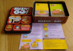 In the super-fast sushi card game Sushi Go!, you are eating at a sushi restaurant and trying to grab the best combination of sushi dishes as they whiz by. Score points for collecting the most sushi rolls or making a full set of sashimi. Dip your favorite nigiri in wasabi to triple its value! And once you've eaten it all, finish your meal with all the pudding you've got! But be careful which sushi you allow your friends to take; it might be just what they need to beat you!
